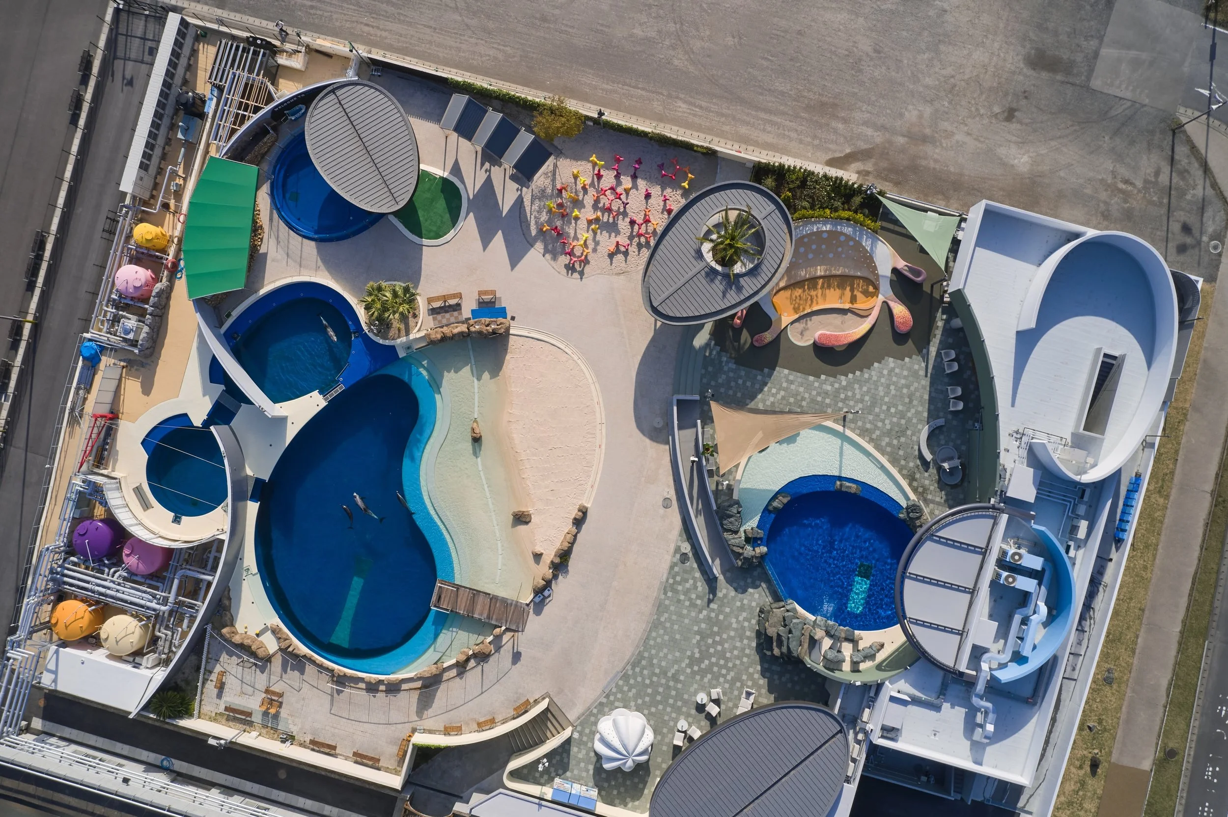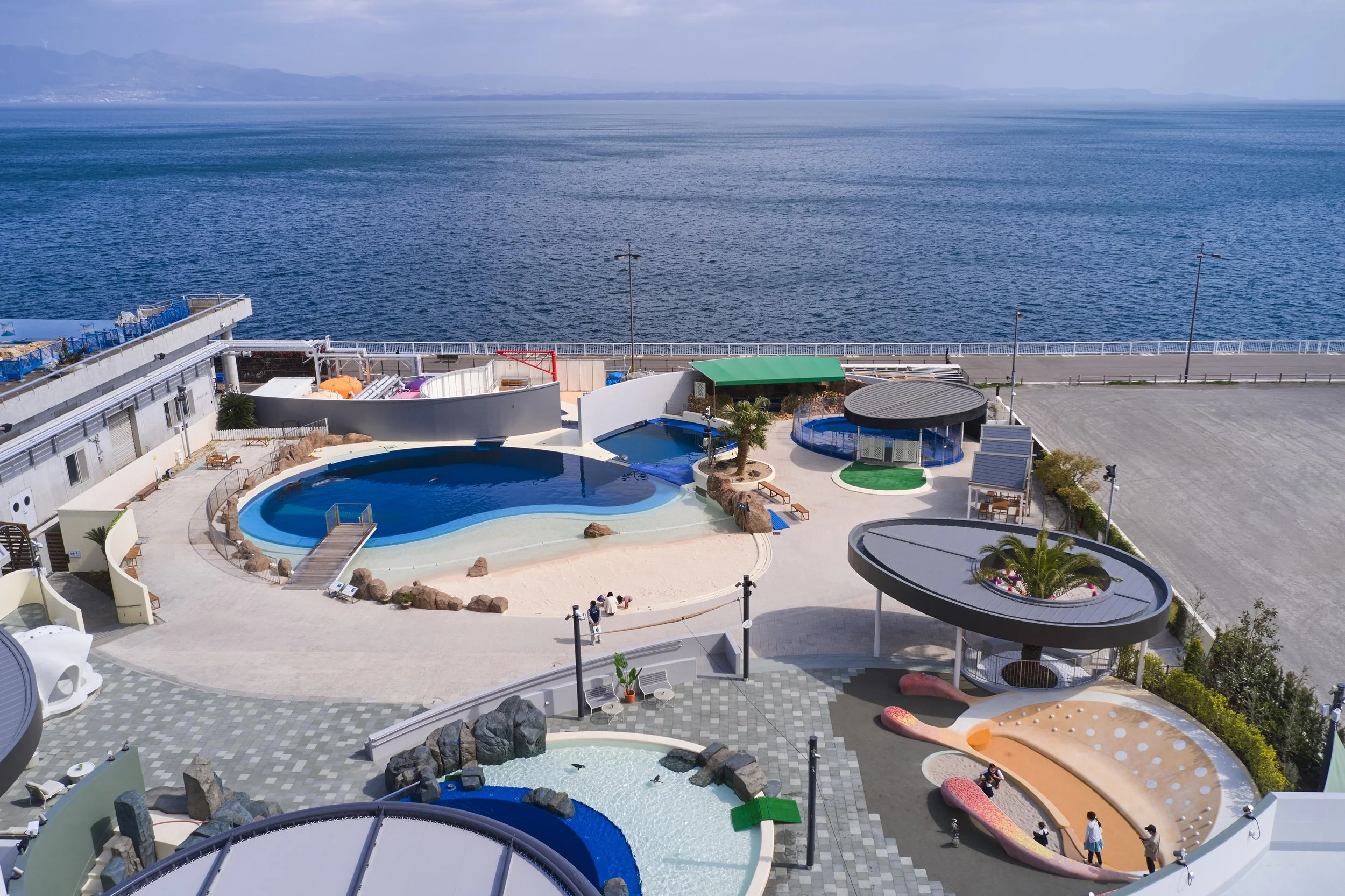 The Jellyfish Ground, planned as part of the second phase of works to expand the “Asobi-chi” completed in 2015, alongside the removal of the Sardine Slide installed ten years prior. The two beloved interactive artworks are: 〈Sherry Hat〉 A mortar-formed pavilion shaped like a seashell. It shelters visitors from the summer sun, offering a resting place much like a hermit crab borrowing a shell. Sunlight filtering through holes pierced in the shell resembles the shimmering movement of bubbles beneath the sea. 〈Coral Maze〉: Multicoloured tetrapods are three-dimensionally linked with steel fittings to form a coral maze. Swimming through it like a small fish feels just like an underwater dwelling. Alongside these Playful-Art, the Jellyfish Ground presents a mortar-moulded slide shaped like a jellyfish. Visitors slide down the jellyfish's bell, climb its nodules, and discover diverse play opportunities in the sandpits and water areas provided on its five tentacles. These elements were planned in conjunction with the scale and furnishings of spaces favoured by marine animals such as penguins and seals. A landscape unfolds where people and marine animals play and relax together.